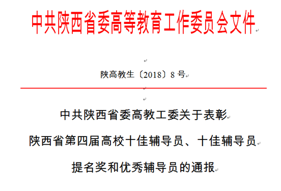 近日,省委高教工委下发文件(陕高教生〔2018〕8号),对陕西省第四届高校十佳辅导员、十佳辅导员提名奖和优秀辅导员进行通报表彰,乐游棋牌辅导员韩二豹、魏蕾同志荣获“陕西省第四届高校优秀辅导员”称号。