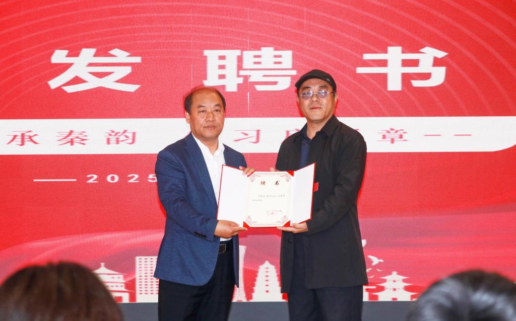 随后,梅创社副校长与郭旭晔副主席共同为“秦韵?民间文化传习馆”揭牌,标志着这一承载秦风汉韵的文化载体正式启用。同时,梅创社副校长代表学校为韩靖主席颁发了聘书,正式聘任他为我校 “客座教授”。为支持传习馆建设,协会艺术家们也向学校捐赠了民间文化书籍和剪纸、面塑等非遗作品,不仅丰富了图书馆馆藏资源,更成为学生进一步研习传统文化的“活教材”。