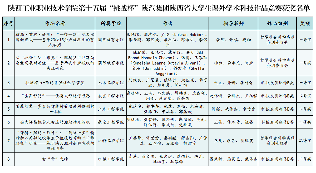 5月24日,由共青团陕西省委、中共陕西省委教育工委、陕西省科学技术协会、陕西省社会科学院、陕西省学生联合会、陕西省西咸新区开发建设管理委员会联合主办的第十五届“挑战杯”陕汽集团陕西省大学生课外学术科技作品竞赛在西安工业大学圆满落幕。我校学子在本届大赛中喜获一等奖3项、二等奖4项、三等奖1项,学校荣获省赛“优秀组织奖”。