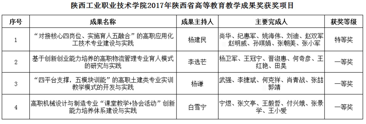 其中,杨建民教授主持的“‘对接核心四岗位、实施育人五融合’的高职应用化工技术专业建设与实践”获2017年陕西省高等教育教学成果奖特等奖。李选芒教授主持的“基于创新创业能力培养的高职物流管理专业育人模式的研究与实践”、杨谦主持的“‘四平台支撑,五模块训能’的高职土建类专业实训教学模式的开发与实践”、白雪宁副教授主持的“高职机械设计与制造专业‘课堂教学+协会活动’创新能力培养体系建设与实践”分别获得2017年陕西省高等教育教学成果奖一等奖。