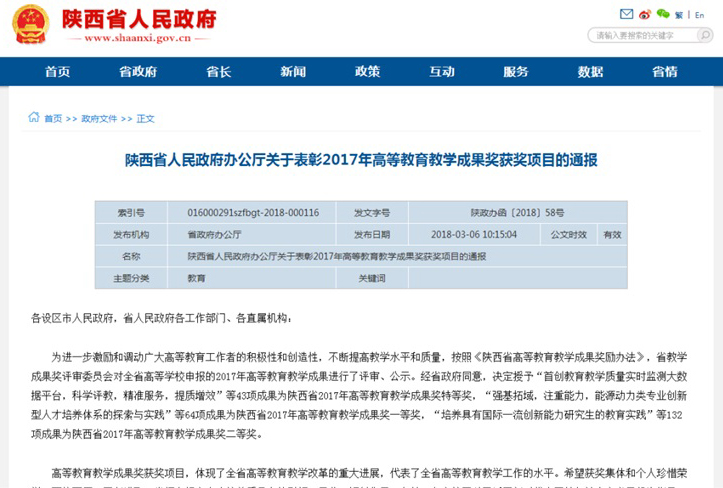 据悉,2017年陕西省高等教育教学成果奖评选活动由省教育厅、省人力资源和社会保障厅组织,经省政府同意,共评出174项优秀教学成果,其中特等奖43项,一等奖64项,二等奖132项。
