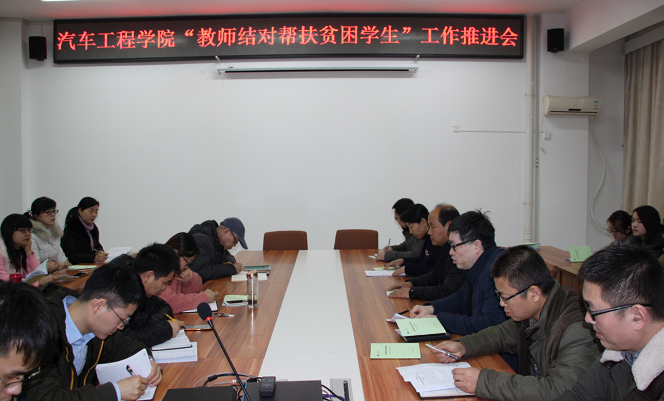 —汽车工程学院 当日,汽车工程学院召开“教师结对帮扶贫困学生”工作推进会,副院长梅创社出席并讲话,汽车学院全体教职工参加了会议。
