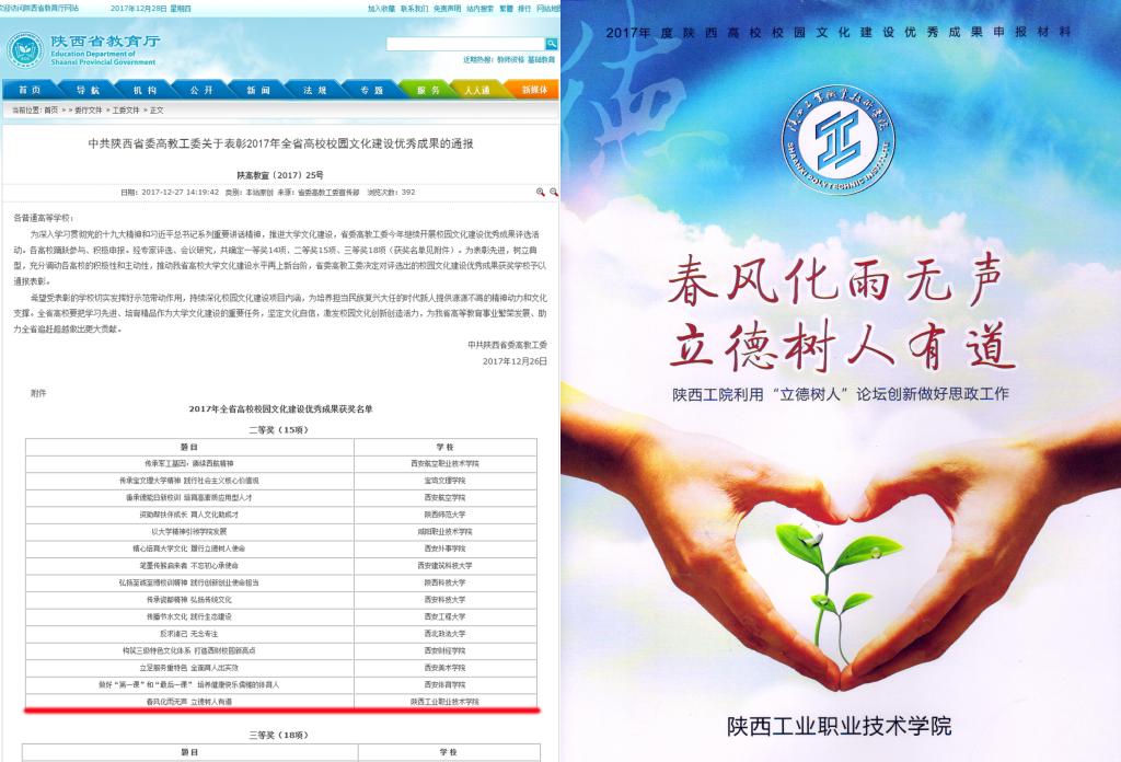 12月26日,省委高教工委公布2017年全省校园文化建设优秀成果的表彰决定,乐游棋牌宣传部申报的《春风化雨无声、立德树人有道——陕西工院连续五年利用“立德树人”论坛创新做好思政工作》的文化建设成果获二等奖,这也是乐游棋牌连续九年获得奖项。目前,乐游棋牌共有“全国高校校园文化建设优秀成果奖”二等奖1项,“陕西省校园文化建设优秀成果奖”一等奖4项、二等奖5项。