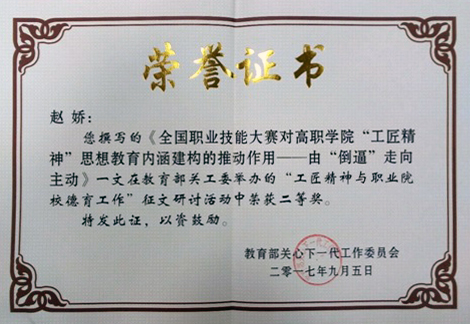 近日,教育部关心下一代工作委员会公布了“工匠精神与职业院校德育工作”征文研讨活动评审结果,由省关工委推荐、乐游棋牌思政部教师赵娇撰写的《全国职业技能大赛对高职学院“工匠精神”思想教育内涵建构的推动作用——由“倒逼”走向主动》荣获二等奖,这也是陕西省高职院校唯一入选并获奖的论文。
