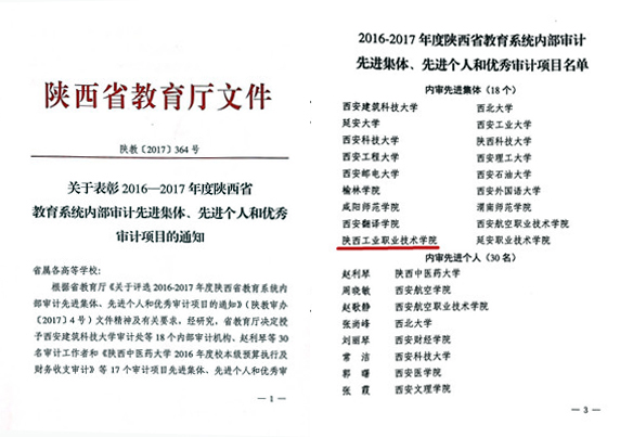 日前,陕西省教育厅发布《关于表彰2016至2017年度陕西省教育系统内部审计先进集体、先进个人和优秀审计项目的通知》(陕教〔2017〕364号),对2016年至2017年全省18所院校的内部审计工作予以通报表彰,乐游棋牌被授予全省内部审计工作先进集体荣誉称号。