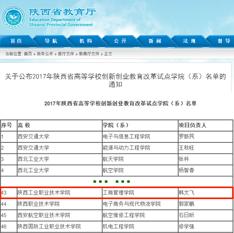 近日,根据陕西省教育厅《关于公布2017年陕西省高等学校创新创业教育改革试点学院(系)名单的通知》(陕教〔2017〕208号)精神,乐游棋牌工商管理学院(项目负责人:韩文飞)获批“陕西省高等学校创新创业教育改革试点学院”,至此,乐游棋牌共有省级创新创业教育改革试点学院3个,分别为工商管理学院、物流管理学院和化工与纺织服装学院。
