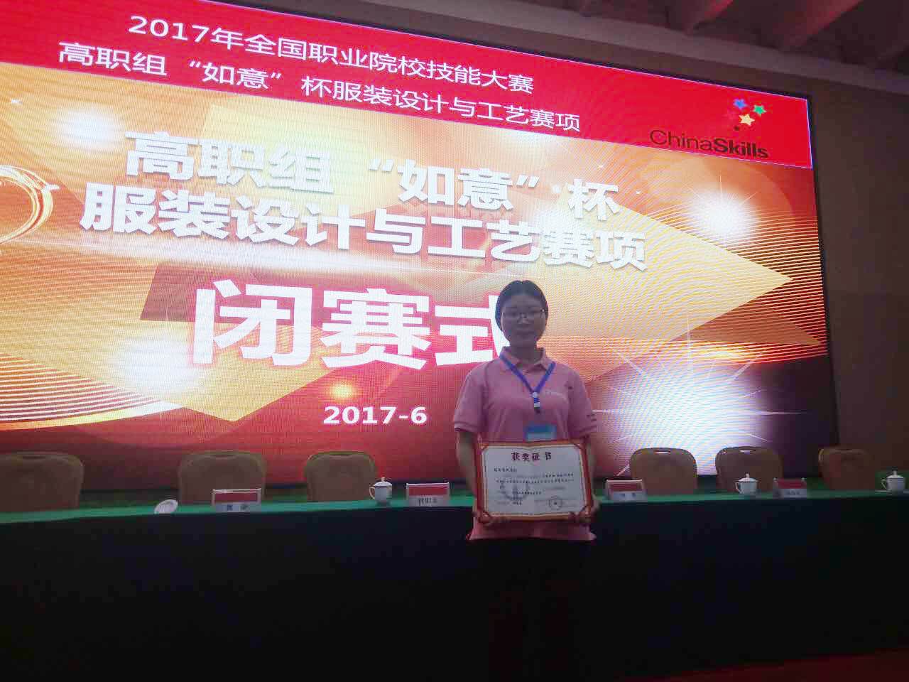 6月2至3日,2017年全国职业院校技能大赛高职组“如意杯”服装设计与工艺技能大赛在山东科技职业学院举行,来自全国26个省、市、自治区75所学校的162名选手参加,经过两天的激烈角逐,由乐游棋牌化工与纺织服装学院教师团队钟敏维、杨玫、张雅娜指导的服装制版与工艺1501班王依然同学获得服装制版与工艺分赛项三等奖。