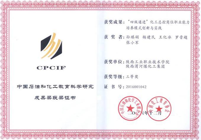 12月26日,全国石油和化工职业教育教学指导委员会2016年工作会议在北京召开,会议公布了第四届中国石油和化工教育科学研究成果奖评选结果。乐游棋牌刘迪、尚华、纪惠军、李婧申报的《基于职业岗位标准的<石油化工工艺>网络课程建设与实践》荣获一等奖;孙琪娟、杨建民、王化冰、罗晋朝、张小军申报的《“四级递进”化工总控岗位职业能力培养模式创新与实践》荣获三等奖。全国职业教育教学指导委员会办公室主任王国川、石化行指委主任任耀生为其颁奖。