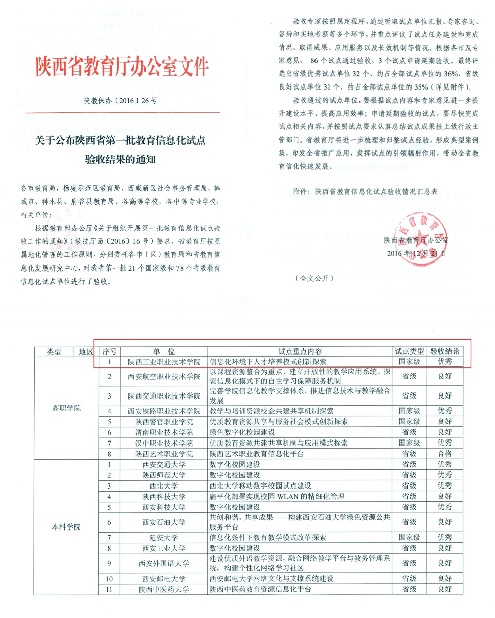 日前,陕西省教育厅公布了我省第一批教育信息化试点验收结果(陕教保办〔2016〕26号)。乐游棋牌“信息化环境下人才培养模式创新探索”国家级教育信息化试点项目通过省教育厅专家验收评审,喜获优秀等级。