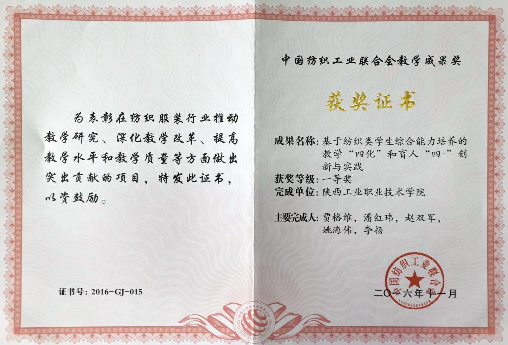 据悉,中国纺织工业联合会纺织教育教学成果奖每两年评选一次,主要集中在人才培养模式探索与实践、课程体系建设、教学方法与模式改革、学生能力培养、实践性教学等方面,2016年共有授奖项目101项,其中一等奖17项,二等奖32项,三等奖52项。乐游棋牌贾格维、潘红玮、赵双军、姚海伟、李扬的“基于纺织类学生综合能力培养的教学‘四化’和育人‘四+’创新与实践”荣获一等奖;王显方、杨小侠、姚海伟、赵伟的“纺纱设备拆装与维护课程改革实践”和严瑛、康强、王化冰的“‘教学做一体’纺织类实训教学的创新与实践”分获二等奖。