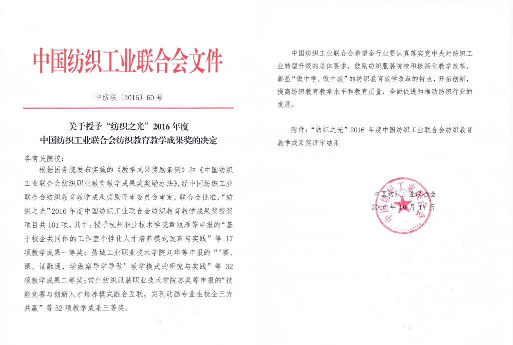 据了解,依据国务院《教学成果奖励条例》和中国纺织工业联合会《纺织职业教育教学成果奖奖励办法》的有关规定,经中国纺织工业联合会组织纺织教育教学成果奖励评审委员会审定,2016年共产生101项“‘纺织之光’2016年度中国纺织工业联合会纺织教育教学成果奖”授奖项目。中国纺织工业联合会号召纺织服装相关院校积极深化教学改革,提高纺织教育教学水平和教育质量,全面促进和推动纺织行业的发展。