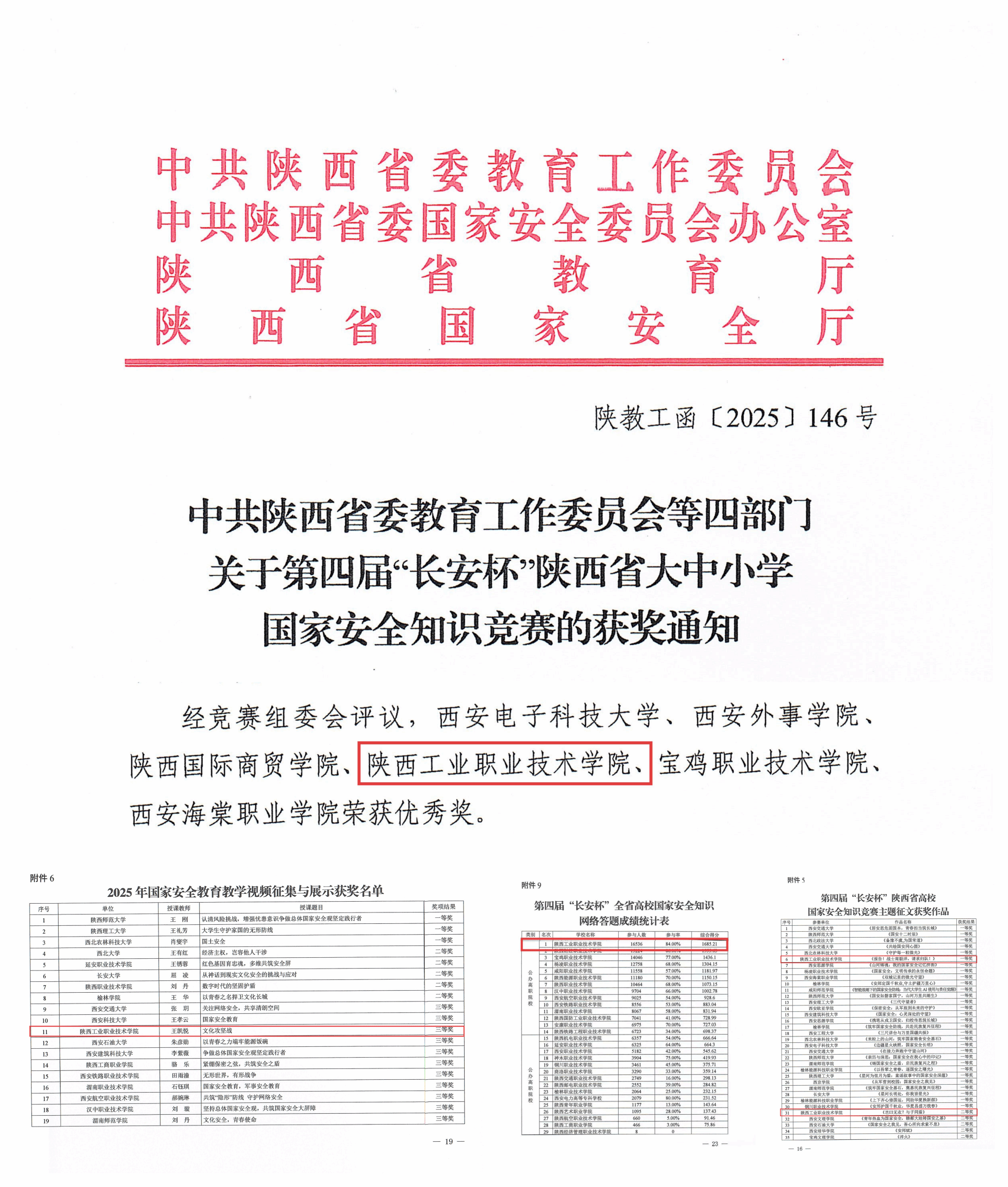近日,中共陕西省委教育工委、中共陕西省委国家安全委员会办公室等四部门联合印发《关于第四届“长安杯”陕西省大中小学国家安全知识竞赛的获奖通知》(陕教工函〔2025〕146号),我校师生凭借扎实的国家安全知识素养,在多个竞赛单元活动中脱颖而出,主题征文荣获一等奖1项、二等奖1项,教育教学视频荣获三等奖1项,学校荣获国家安全知识竞赛“优秀奖”。