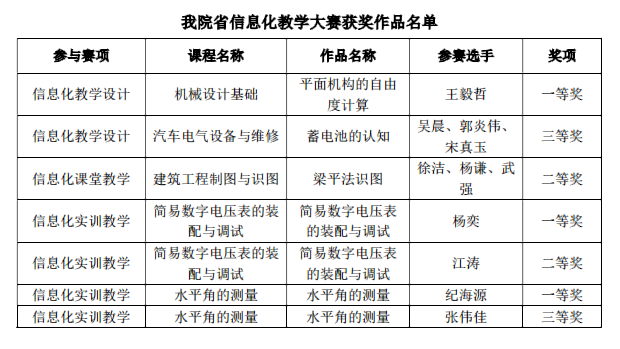 本次大赛共设信息化教学设计、信息化课堂教学、信息化实训教学等三个大项,其中信息化实训教学设简易数字电压表的装配与调试、水平角的测量2个分赛项。据悉,本次大赛共有27所高职院校选送114件作品参赛,经专家评审,并经大赛组委会同意,评选出一等奖12项、二等奖18项、三等奖28项。本次大赛乐游棋牌共推荐8件作品参加了所有4个赛项,7件作品获奖,其中3个赛项获一等奖,参赛作品数量、获奖作品数量、参加过赛作品均位居全省高职院校前列。这也是自2012年以来,乐游棋牌连续第五年在全国职业院校信息化教学大赛陕西省赛区比赛中获得好成绩。