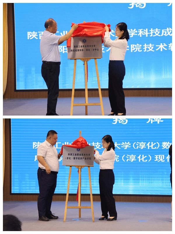 我校副校长刘清、段峻分别与淳化县副县长马烨为我校科技成果转移(淳化)分中心、数字经济产业学院揭牌