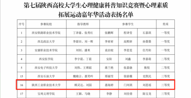 由惠海婷、门珂琪、刘思瑶三位同学组成的心理健康科普知识团队荣获第七届陕西高校大学生心理健康科普知识竞赛暨心理素质拓展运动嘉年华活动三等奖。