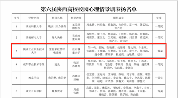 由我校心理咨询中心教师董亲子、任雨睿指导的校园心理情景剧《紫色彩虹的呼吸法则》荣获第六届陕西高校校园心理情景剧一等奖。