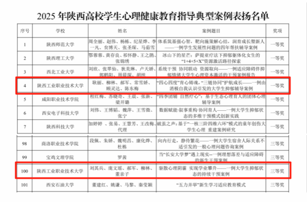 由耿丽教师团队撰写的《“四心四度”育心铸魂,“三链协同”护航成长——一例由消极自我认识引发的大学生抑郁辅导案例》和刘其兵教师团队撰写的 《驱散心理阴霾 实现学业攀升——一例大学生抑郁状态的持续干预案例》分别荣获2025年陕西高校学生心理健康教育指导典型案例一等奖、三等奖。