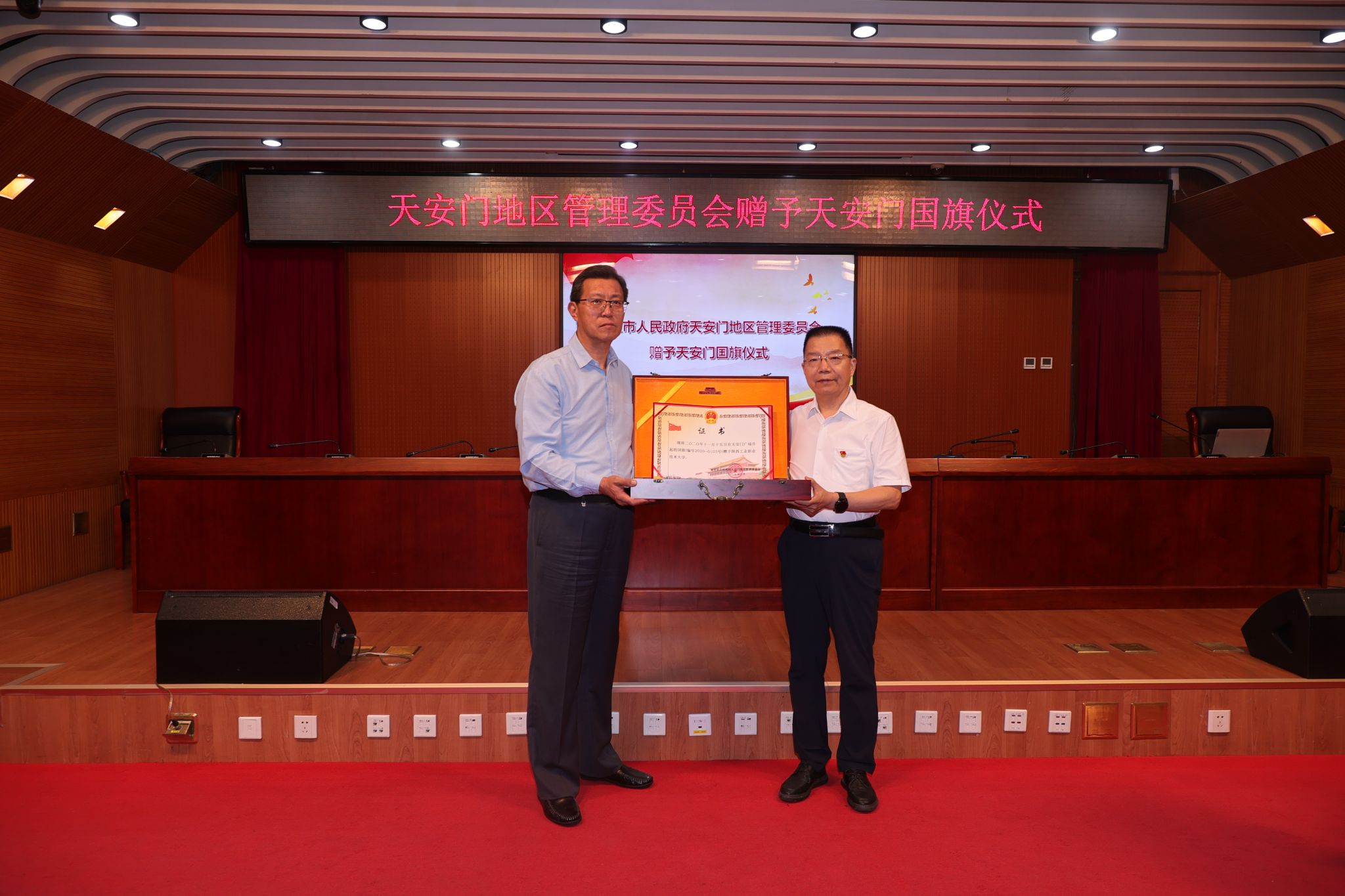 赠予仪式在北京市人民政府天安门地区管理委员会举行,北京市人民政府天安门地区管理委员会党组成员、副主任(正局长级)姚辉向学校赠予国旗并就国旗保管使用提出相关要求,党委书记惠朝阳代表学校迎请国旗,双方签订《国旗赠予协议》。