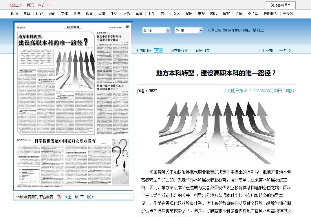3月29日,《光明日报》在其“职业教育”版(15版)刊发乐游棋牌党委书记、陕西省职教学会会长崔岩教授的专题文章。崔岩教授的文章以《地方本科转型,建设高职本科的唯一路径?》为题,从四个维度探讨了发展高职本科,完善高等职业教育体系的趋势和走向,现将全文转载如下: