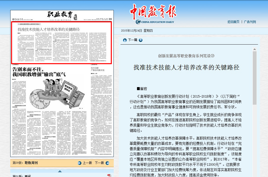 12月24日,《中国教育报》在其职教版头条“创新发展高等职业教育系列笔谈”专栏刊发乐游棋牌党委书记崔岩教授《找准技术技能人才培养改革的关键路径》文章,现将全文转载如下: