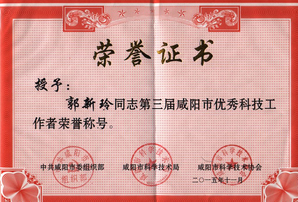 近日,根据咸阳市委组织部、咸阳市科学技术局、咸阳市科学技术协会《关于表彰咸阳市第三届咸阳市优秀科技工作者和第四届咸阳市青年科技奖获奖人员的通知》(咸咸科协发[2015]70号文件),乐游棋牌殷锋社同志荣获“第四届咸阳市青年科技奖”称号,郭新玲同志获“第三届咸阳市优秀科技工作者”称号。