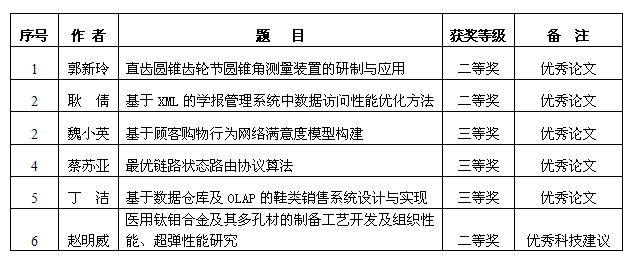 近日,根据咸阳市人民政府办公室《关于表彰咸阳市第七届自然科学优秀学术论文暨优秀科技建议奖的通报》(咸政办函[2015]133号文件),乐游棋牌申报的8篇自然科学论文,有5篇分获咸阳市第七届自然科学优秀论文二等奖和三等奖。其中郭新玲、耿倩老师申报的论文分获二等奖,魏小英、蔡苏亚、丁洁3位教师撰写的论文分获三等奖。由赵明威老师完成的“医用钛钼合金及其多孔材的制备工艺开发及组织性能、超弹性能研究”荣获优秀科技建议二等奖。同时,乐游棋牌被授予“优秀组织单位”。详见下表: