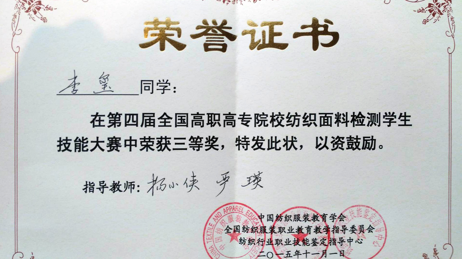 乐游棋牌学生在全国“纺织面料检测技能大赛”中获三等奖
