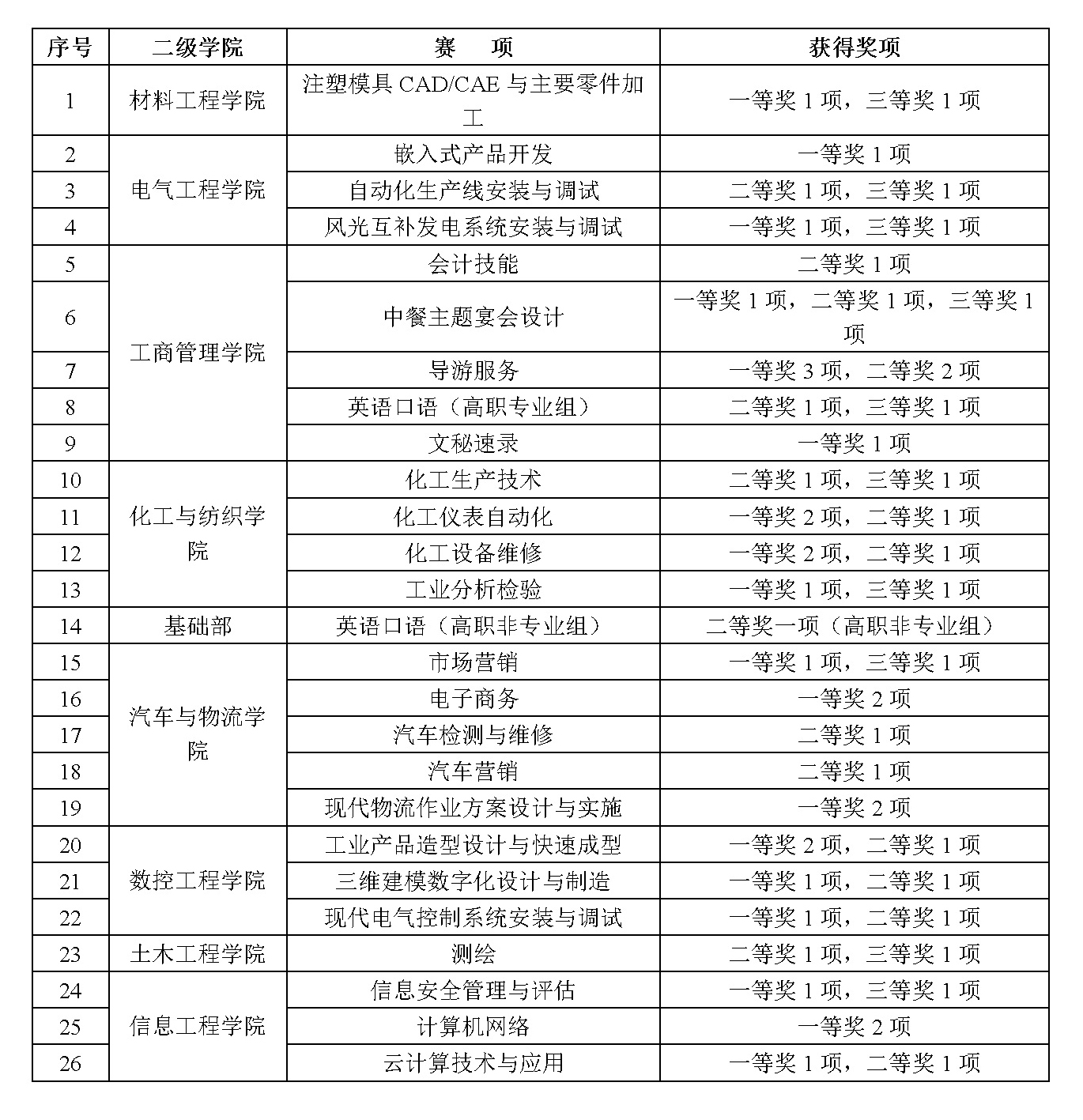 2015年,省级职业院校技能大赛共设29个赛项,基本对接国家级技能竞赛项目,受教育厅委托,乐游棋牌承办了省级技能竞赛项目14项。乐游棋牌各代表队经过扎实训练,精心准备,积极应战,在省赛中取得了优异的成绩。其中材料工程学院获一等奖1项,三等奖1项;电气工程学院获一等奖2项,二等奖1项,三等奖2项;工商管理学院获一等奖5项,二等奖4项,三等奖2项;化工与纺织学院获一等奖5项,二等奖3项,三等奖2项;基础部获二等奖1项;汽车与物流学院获一等奖5项,二等奖2项,三等奖1项;数控工程学院获一等奖4项,二等奖3项;土木工程学院获二等奖1项,三等奖1项;信息工程学院获一等奖4项,二等奖1项,三等奖1项。