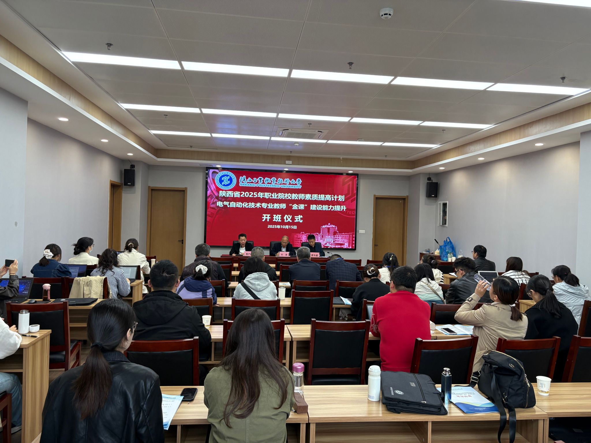 10 月 15 日上午 ,陕西省 2025 年职业院校教师素质提高计划国家级培训项目 “电气自动化技术专业教师‘金课’建设能力提升” 培训班开班仪式在经开校区启新楼培训教室举行。副校长刘清,电气工程学院、继续教育与培训学院负责同志,培训班相关管理人员及全体学员参加仪式。