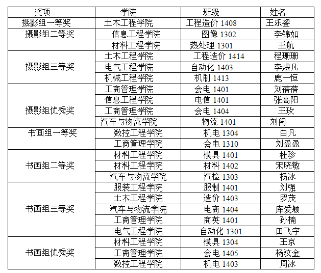本次活动持续展出两天,共有150副作品参加展出。这些作品中有古色古香的隶书、潇洒飘逸的行书、还有展现传统文化的国画、充满“洋味儿”的漫画,更多的是展现乐游棋牌美丽风光的摄影作品,充分体现了“多彩视觉”的活动主题,受到师生们的一致好评。为了鼓励大家积极参与,展览后这些作品被分为书画和摄影两类进行了评选,评出一二三等奖和优秀奖若干(获奖名单表见表)。