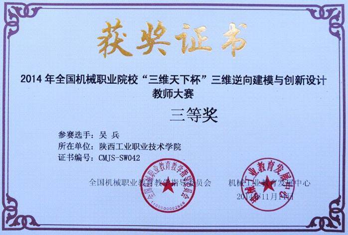 11月10至14日,由全国机械职业教育教学指导委员会和机械工业教育发展中心主办的2014年全国机械职业院校“三维天下杯”三维逆向建模与创新设计教师大赛在天津举行,39所高校的53名教师选手参加了比赛,乐游棋牌数控工程学院教师吴兵荣获三等奖。
