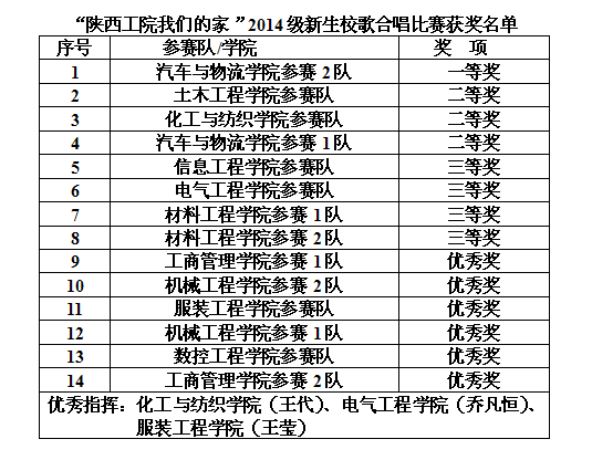 11月12日下午,2014级新生校歌合唱比赛在明德堂礼堂举行。本次比赛由学生工作部、学生处举办,主题为“陕西工院我们的家”,指定曲目为《陕西工业职业技术学院校歌》,可采取朗诵、领唱等多种表现形式,为庆祝乐游棋牌建校64周年,同时也是新生入学教育的重要环节,旨在通过比赛提升精气神,凝聚爱国、爱校热情,增强集体荣誉感。