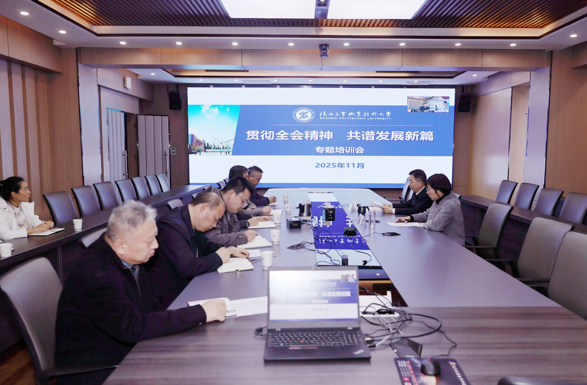 为深入学习贯彻党的二十届四中全会精神,切实把思想和行动统一到党中央决策部署上来,将全会精神转化为推动学校高质量发展的强大动力,11月12日下午,我校在渭城校区崇文南楼九楼第一会议室举办“贯彻落实二十届四中全会精神 共谱学校高质量发展新篇章”专题培训会。会议采取“线下主会场+线上同步直播”形式举行。学校党委书记惠朝阳出席会议并讲话,党委教师工作部、教务处、科研处、发展规划处、教育教学质量管理中心负责同志作主题报告,各二级院(部)全体教师参加培训。学校党委副书记马晓云主持会议。