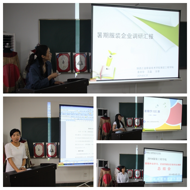 9月1日下午,服装工程学院2014年暑期外出学习、企业实践及企业调研回访工作总结汇报会在服装设计工作室举行。该院暑期外出学习的4名教师及参与企业实践和企业调研、回访的4个小组的代表进行了交流发言,服装学院全体教职工参加会议,服装学院院长乌军锋主持会议。