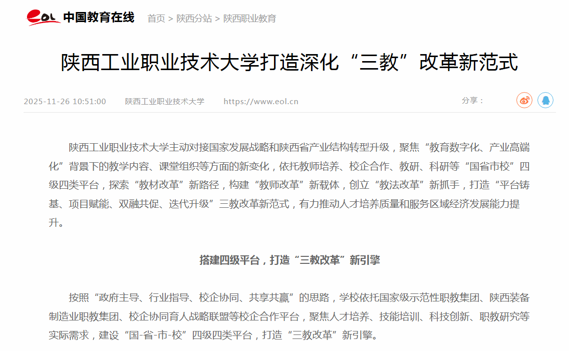 陕西工业职业技术大学主动对接国家发展战略和陕西省产业结构转型升级,聚焦“教育数字化、产业高端化”背景下的教学内容、课堂组织等方面的新变化,依托教师培养、校企合作、教研、科研等“国省市校”四级四类平台,探索“教材改革”新路径,构建“教师改革”新载体,创立“教法改革”新抓手,打造“平台铸基、项目赋能、双融共促、迭代升级”三教改革新范式,有力推动人才培养质量和服务区域经济发展能力提升。