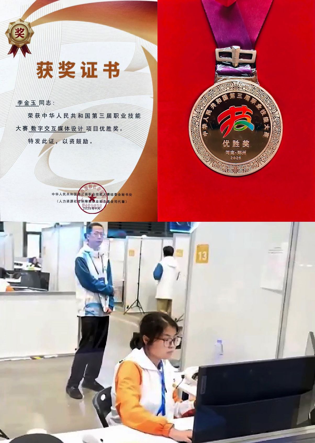 近日,人社部公布全国第三届职业技能大赛获奖名单,我校信息工程学院数字媒体技术专业李金玉同学代表陕西省参加数字交互媒体设计赛项比赛,荣获优胜奖,并被陕西省人社厅直接认定为全媒体运营师职业技师。