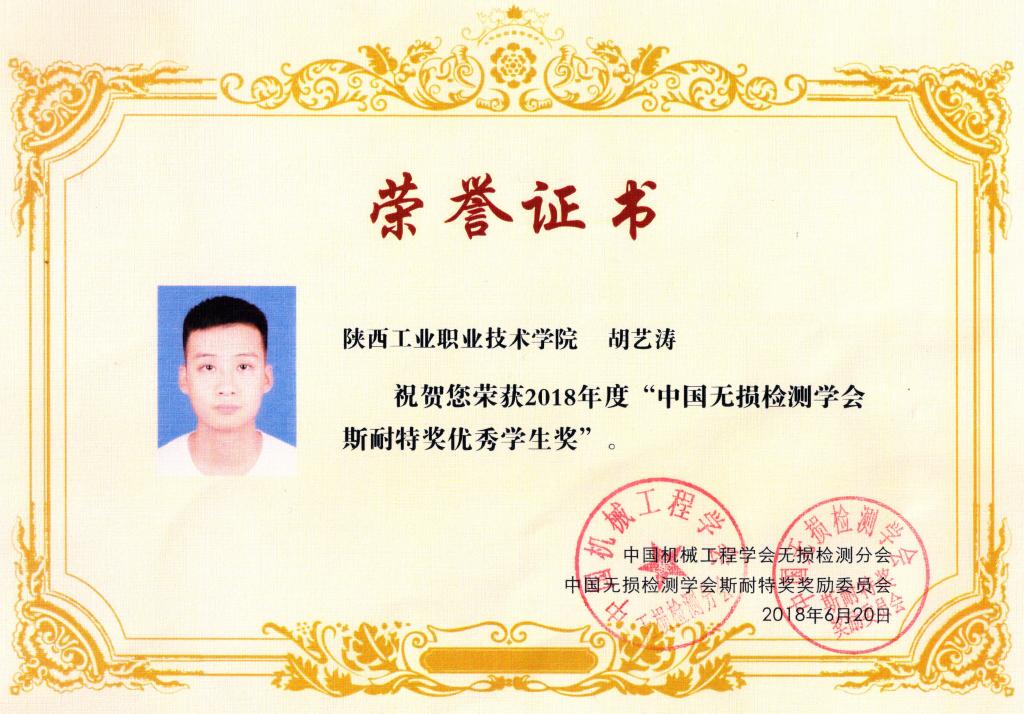 近日,经过前期申报、评委会审核、评审公示等多个环节,2018年度“中国无损检测学会斯耐特奖”获奖名单公布,乐游棋牌材料工程学院质检1501班胡艺涛同学荣获中国无损检测学会斯耐特优秀学生奖。