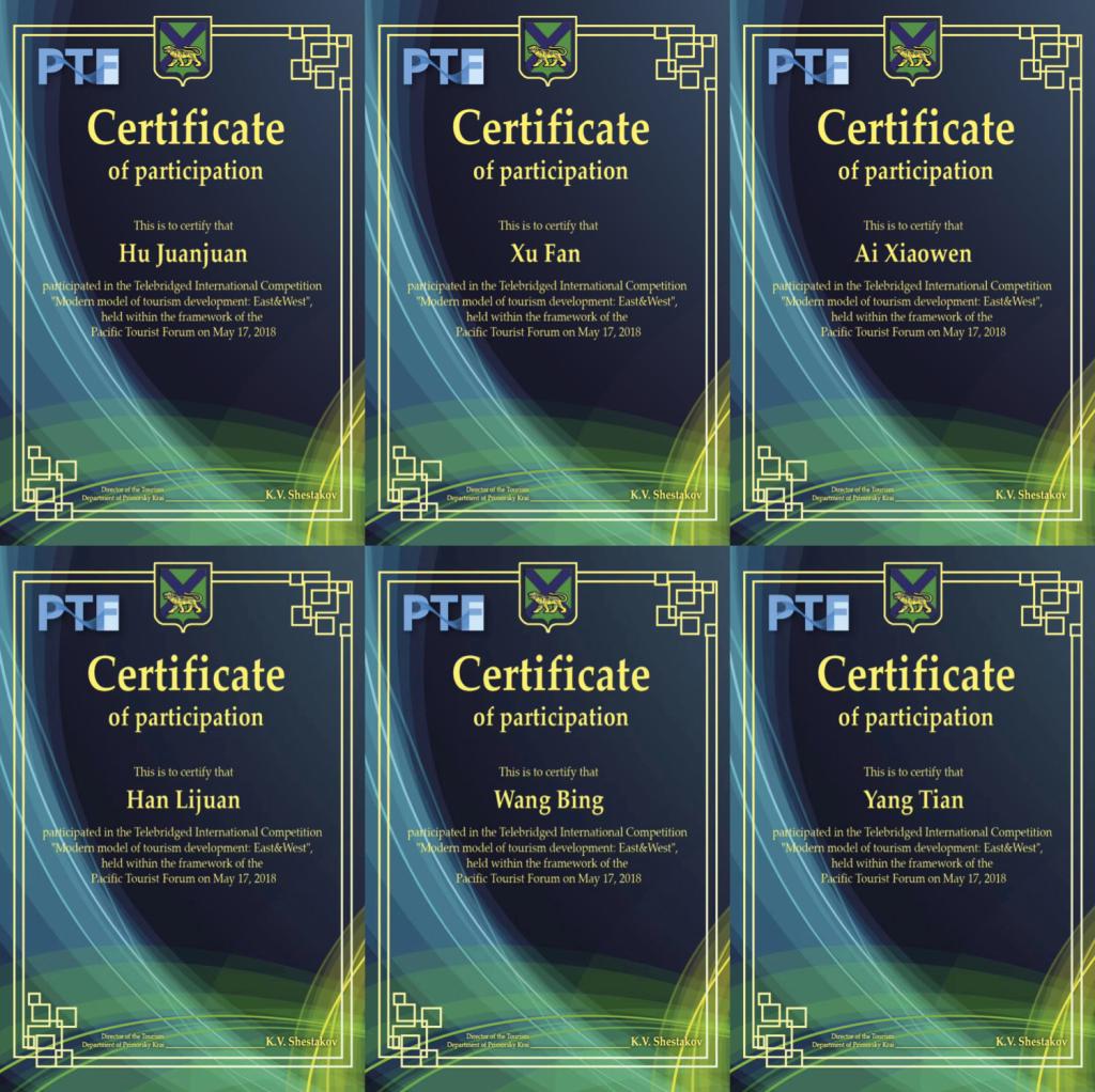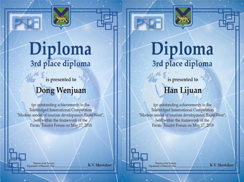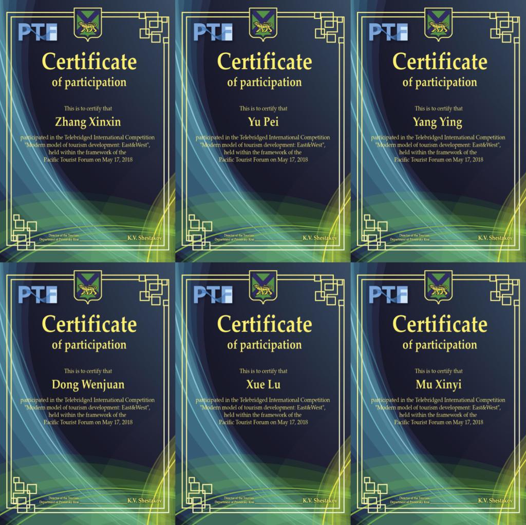 本次太平洋国际旅游论坛围绕“探讨东西方现代旅游业发展模式”的主题,共有来自俄罗斯、中国、韩国、约旦等国家的27名选手参赛。经过角逐,乐游棋牌旅游1701班董文娟、商英1601班韩丽娟同学获得大赛三等奖,其他10名同学获得优秀参与奖。
