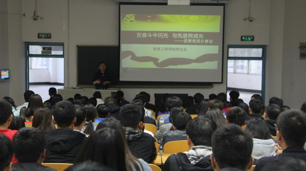为推进“两学一做”学习教育常态化制度化,创新开展“两学一做”特色活动,强化党员的旗帜示范作用,10月30日下午,信息工程学院党总支举办“在奋斗中闪光,与先进同成长”优秀党员分享会,邀请优秀共产党员赵革委同志为该学院学生党员、第七期发展对象、入党积极分子及学生会干部进行分享,党总支书记闫军主持分享会。
