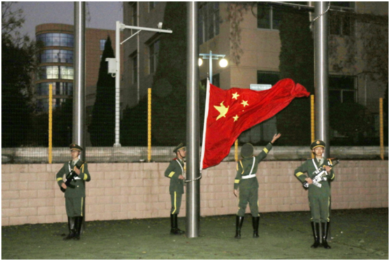 6时50分,升旗仪式开始,国旗班队员们迈着整齐的步伐入场,同学们肃穆而立,在激昂的国歌声中目视国旗徐徐升起。