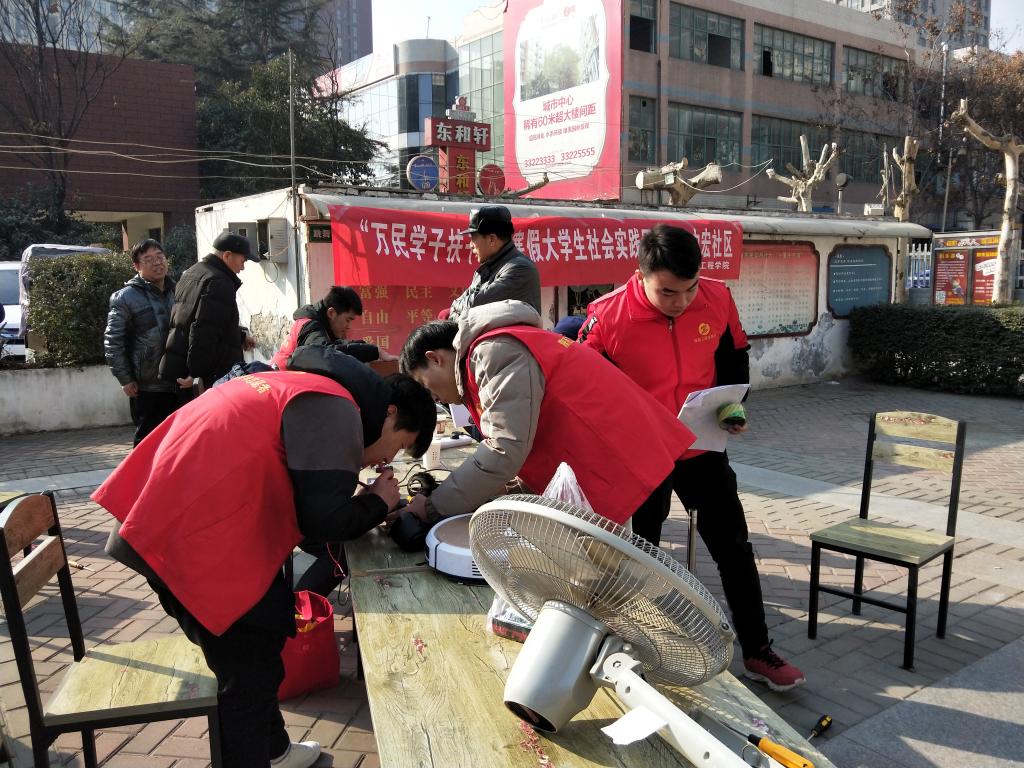 为落实《中共陕西省委教育工委关于组织开展“万名学子扶千村”2019年寒假社会实践扶贫攻坚专项活动的通知》(陕教工团〔2019〕1号)文件精神,提高大学生服务他人、服务社会的责任意识,1月17日,电气工程学院电气维修协会与乐游棋牌书画社共计14名学生在学工办辅导员的带领下前往咸阳市中宏社区进行义务家电维修、送春联活动。