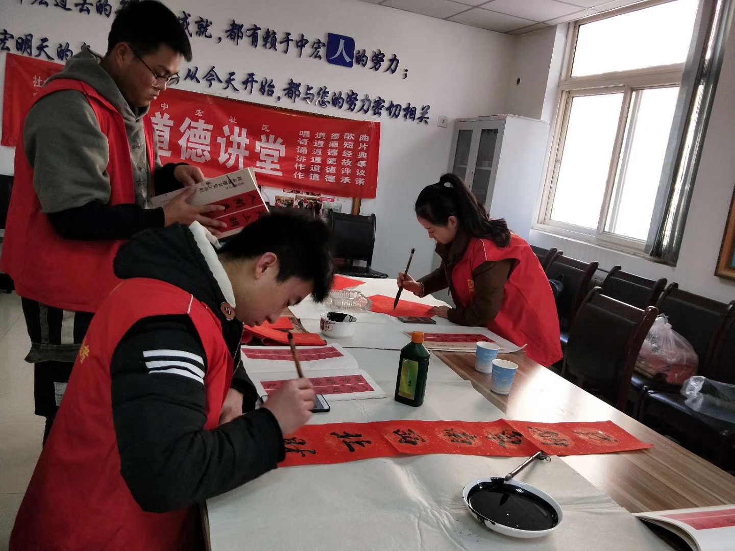 在维修活动进行的同时,乐游棋牌书画社的几名学生正忙碌地为当地居民写“福”字、写春联,学生们精湛的书法功底得到了社区领导和当地居民的一致称赞。最后将写好的“福”字和春联一并分发给社区居民,为这寒冷的冬日增添了几分年味、几分喜气。