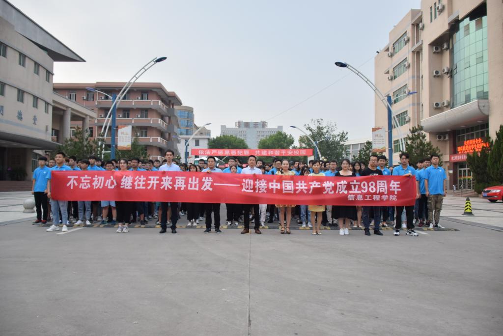 为庆祝建党98周年,进一步激发学生爱校、爱党、爱国的热情,在七一建党节来临之际,6月24日清晨,信息工程学院在南门广场开展“国旗下的成长”主题教育活动,本次活动的主题是“不忘初心继往开来再出发——迎接中国共产党成立98周年”。信息工程学院党总支书记闫军、学工办全体辅导员、学生预备党员及部分2018级学生共计400余人参加了本次活动。
