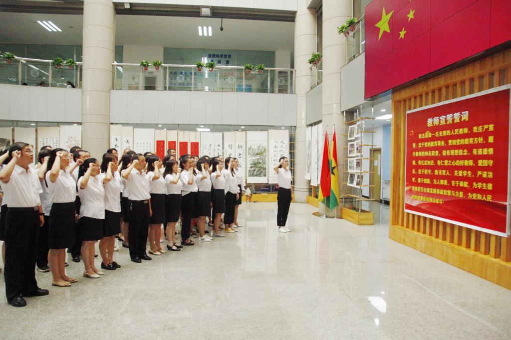 在校史馆,全体教师重温历史,认真了解了学院的历史发展进程、特色文化底蕴和取得的巨大成就。在一幅幅珍贵的历史画面前,大家感动着不同时期学校的建设者们所付出的艰辛努力和无私奉献精神,自豪着建校69年来所取得的辉煌成就。在图书馆一楼大厅,全体教师共同学习了《新时代高校教师职业行为十项准则》和《高等学校教师职业道德规范》;在领誓人康谨老师带领下,全体教师举起右拳,面对国旗进行了庄严宣誓。