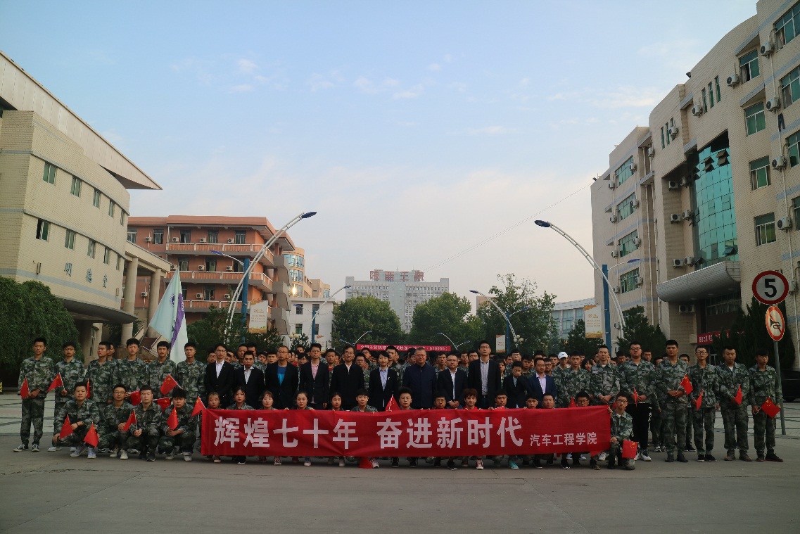 为庆祝中华人民共和国成立70周年,激励同学们树立远大理想,弘扬爱国主义精神,汽车工程学院于9月23日上午在学校南门广场举办了“辉煌七十年 奋进新时代”主题教育活动。汽车学院院长韩伟、党总支书记高亚宁、教师代表以及2019级全体学生共计300余人齐聚学院南门广场,举行升旗仪式。