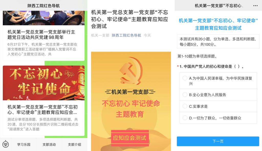 活动中,支部利用“陕西工院红色导航”微信平台推送测试题,并引导党员同志利用业余时间参与答题。测试面向支部全体党员,分为单项选择、多项选择和正误判断3种题型,满分100分,考察内容涵盖学院主题教育领导小组办公室下发的《应知应会手册》中的相关章节。党委书记惠朝阳、支部各部门副处级以上党员干部带头参与答题。