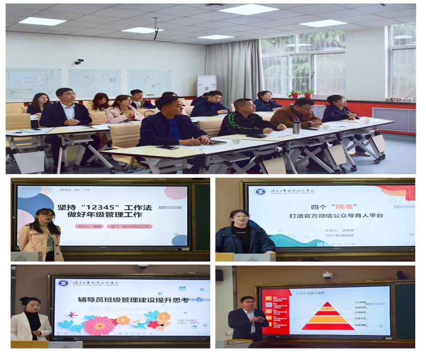 活动中,杨阳、沈燕丽、张斯瑶、宋国豪四位同志以日常工作为切入点,结合自身经验,凝练总结,分别进行了“12345”工作法开展年级管理;“四个精准”打造官微育人平台;建设“三型”班级,打造“三连”共同体;守好安全阵地,打造温馨寝室四方面的分享。