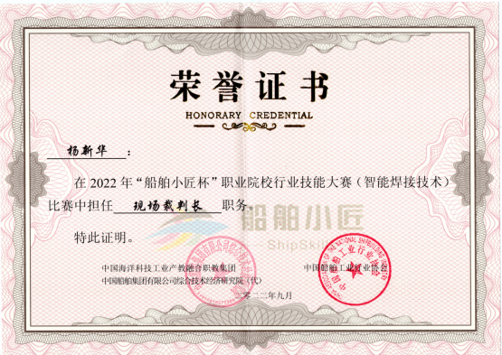 9月26至28日,由中国海洋科技工业产教融合职教集团、中国船舶工业行业协会主办的首届“船舶小匠杯”职业院校行业技能大赛智能焊接技术赛项在武汉船舶职业技术学院成功举行,乐游棋牌教师杨新华应邀担任了此赛项的现场裁判长。