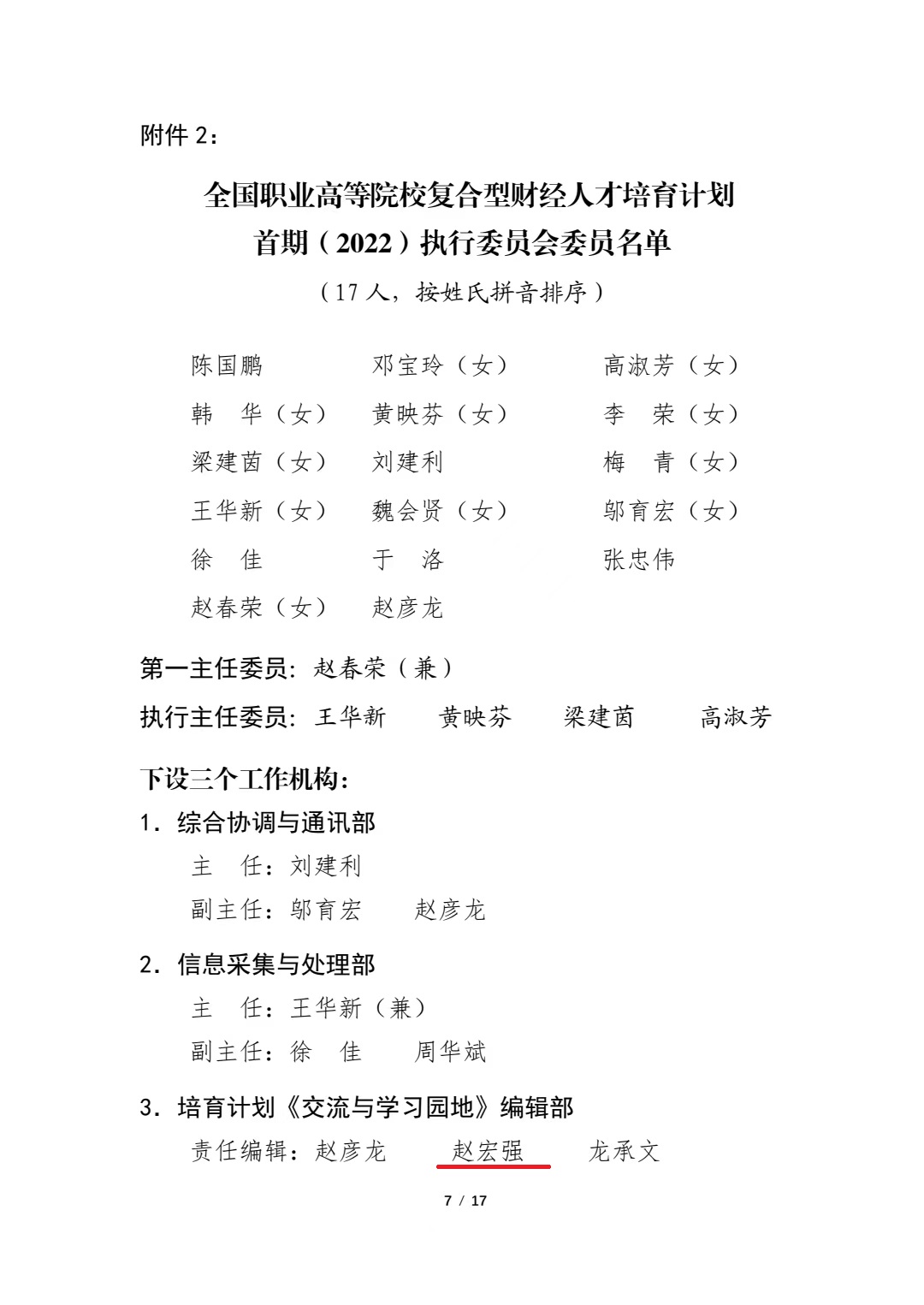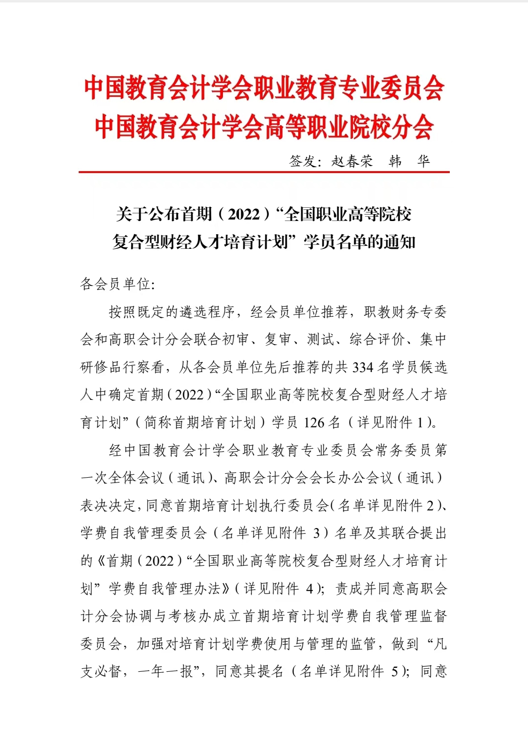 9月30日,中国教育会计学会职业教育专业委员会、高等职业院校分会公布首期(2022)“全国职业高等院校复合型财经人才培育计划”学员名单,我校财务处赵宏强副教授名列其中,并担任培育计划《交流与学习园地》编辑部责任编辑。
