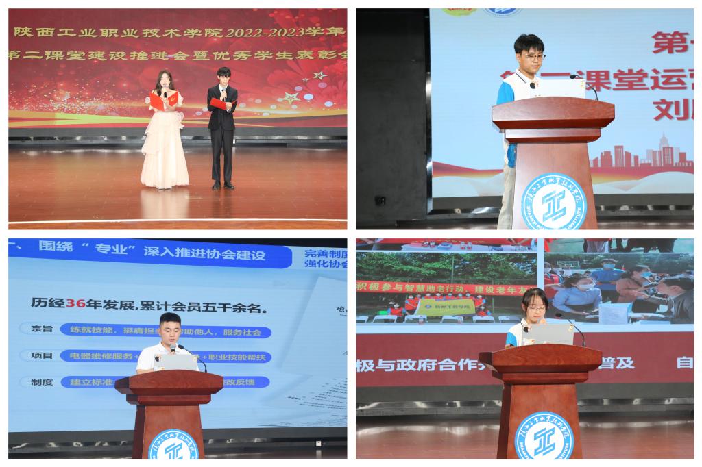 会上,学校第二课堂运营中心刘鹏飞,从“第二课堂成绩单制度基本情况、第二课堂成绩单制度实施过程数据分析、第二课堂成绩单制度实施-结果数据分析、存在问题与不足、下一步工作举措”等方面,就2022-2023学年第二课堂成绩单制度数据信息平台情况进行了汇报;接着“实践智慧助老,打通数字坦途”志愿服务项目等2个学校立项建设的第二课堂精品项目(活动),立足青年学生视角,从“基本情况、主要做法、工作成效、工作启示”等方面分享交流了第二课堂精品项目(活动)典型做法和优秀经验,干货满满的分享赢得了师生掌声,为深入推进第二课堂精品项目(活动)项目化建设,开发多维立体化第二课堂教育资源,推动第二课堂项目(活动)提质增效提供了借鉴。随后,参会团干部分别为第二课堂申请类优秀学生、“六个一百”育人行动优秀学生及各个二级学院第二课堂学时排名靠前的优秀学生颁发证书;表彰仪式后,团委书记赵双军分别从“如何做好第二课堂精品项目(活动)、如何扩大第二课堂成绩单的价值应用、如何进一步畅通第二课堂组织实施机制”三个方面进行了汇报交流。最后,团员青年代表表演舞蹈《党旗飘扬的方向》等,展现了我校在第二课堂文体活动的建设成果。